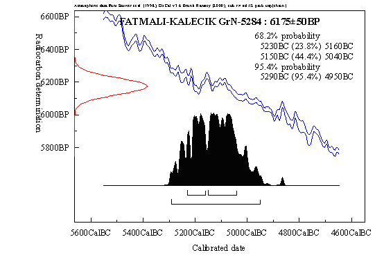 | Açıklama: Fatmalı Kalecik'te İlk ve Son Kalkolitik Çağ'a tarihlendirlen iki tabaka saptanmıştır. 14C örneği yüzeyde tahrip olmuş bir ocaktan alınmıştır. |
