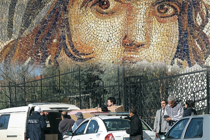 Gaziantep'te Fırat Nehri Kıyısı'ndaki Zeugma antik kentinin, sular altında kalmaktan kurtarılan bölümlerinden çıkarılan mozaik ve eserler 3 ay içinde parça parça müzeye transfer edildi. En değerli iki eser olan 'Çingene Kızı' mozaiği ve Roma Savaş Tanrısı 'Mars Heykeli'nin taşınması son ana bırakıldı. Lazerli güvenlik sistemiyle korunan eserlerin taşınması için Kültür ve Turizm Bakanlığı olağanüstü önlemler aldı. Büyük bir gizlilikle yürütülen transferi AKŞAM görüntüledi. İşte transfer süreci: Eserler, müzeye garajdan sokuldu. 'Çingene Kızı' mozaiği ve 'Mars Heykeli' arkeologlar tarafından paketten çıkartılarak müzeye yerleştirildi. Lazer güvenlik sistemi aktif hale getirildi. Bu ay Başbakan tarafından açılması beklenen müzede 73 ayrı eser sergilenecek. Akşam, Haber: Günay Yılmaz, 03.02.2011 |