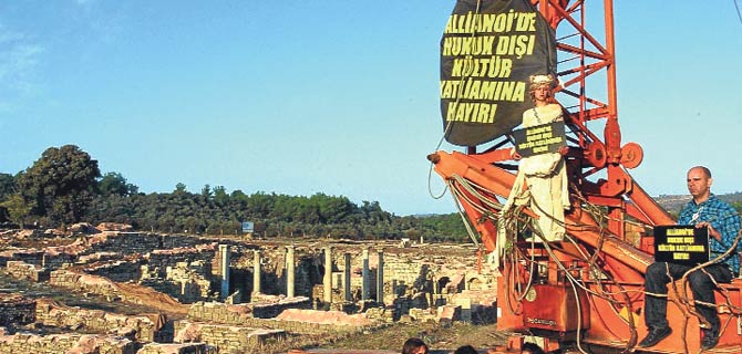 Doğa Derneği üyelerinin Allianoi’de kendilerini zincirlerle vinçlere bağladıkları eylem mahkemelik oldu. Antik kenti kumla kapatan inşaat şirketinin şantiyeşefi Abdil Serkan Ülgen, dernek üyelerinin vinçlerde 2 bin 665 TL’lik zarara neden olduklarını ileri sürerek şikayetçi oldu. Allianoi antik kentinin Yortanlı Barajı’nın suları altında kalmasının üzerinden 10 aya yakın zaman geçti, ancak davalar bitmedi. Bu kez de Doğa Derneği üyelerinin geçen yıl eylül ayında antik kentin toprakla örtülmesini önlemek amacıyla yaptığı zincirli eylem mahkemelik oldu. Milliyet Ege, Haber: Turan Gültekin, 29.09.2011 |