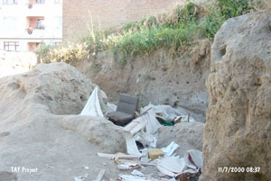 Höyüğün batı tarafında ve yamaçtaki kısımlard definecilerin açtığını sandığımız çukurları gördük. Fakat köylülerin söylediğine göre bu çukurlar, su taşkınlarına karşı yapılmış buğday siloları. Höyüğün üzeri de saman deposu olarak kullanılıyor. Kuzeybatı kısmındaki arkeolojik dolgu ise bir falez gibi dik biçimde kesilerek ev inşaatında kullanılmış.